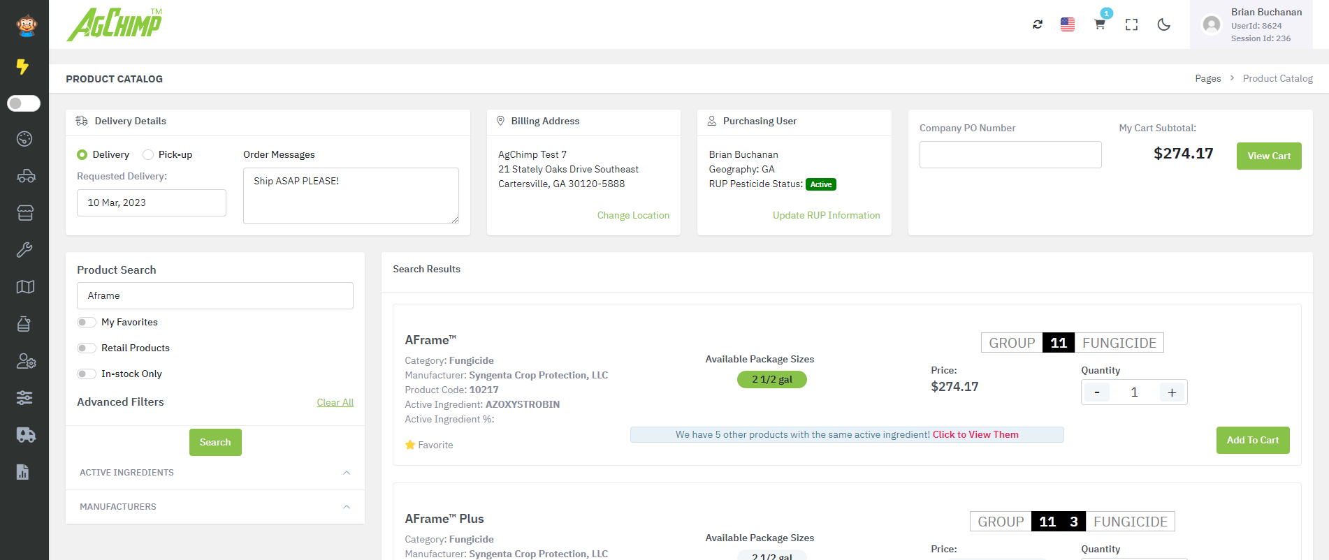 We believe that straightforward pricing should always put the farmer first. That's why our AgChimp Marketplace offers a one-stop-shop for all your pesticide and fertilizer needs, with competitive pricing negotiated to benefit you. Plus, our cutting-edge logistics system uses technology to allocate inventory in our warehouse and arrange delivery with the trucking company, without the need for sales reps, logistical dispatchers, or transportation coordinators.